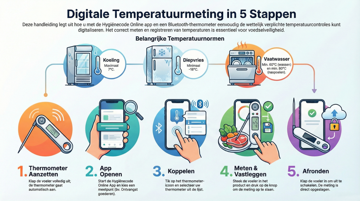 TIP: Naast dat het gebruiken van een vervuilde thermometer niet hygiënisch is, is het risico op kruisbesmetting ook erg groot. Gebruik altijd een schone en gedesinfecteerde thermometer. Je kunt deze gemakkelijk schoonmaken met een desinfectiedoekje of papier met handdesinfectiemiddel.