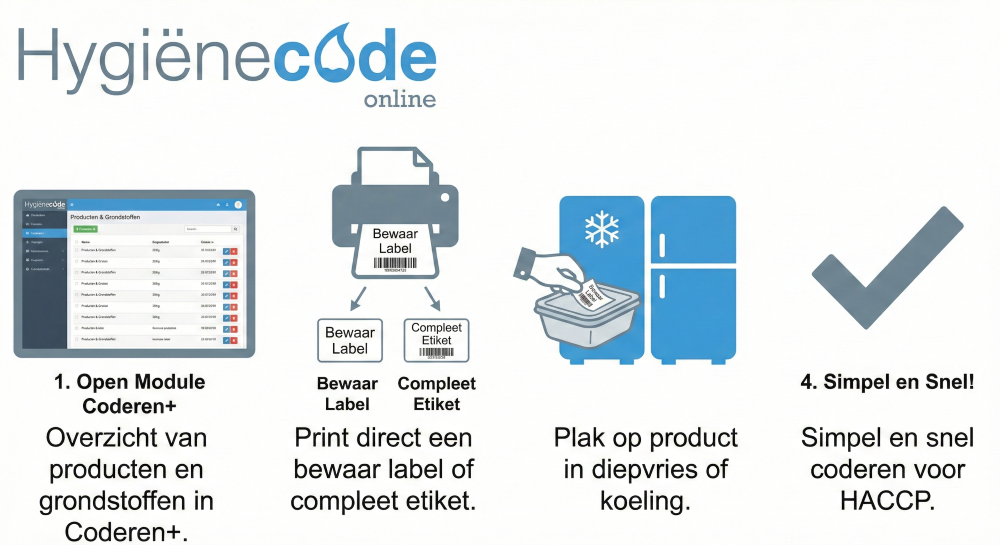 Ook voor deze oplossing hebben we nog een codeer module, waar u stickers print met naam product en de tijd en datum, zodat dit duidelijk is tot wanneer het verkocht mag worden. Naam module is ongekoel coderen.