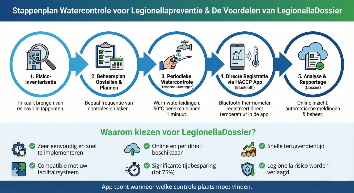 Wij hebben een eenvoudige legionellapreventie module ontwikkeld: legionellabeheer. De module legionellabeheer en een thermometer die via bluetooth gekoppeld is aan het systeem uitgevoerd. Hierdoor hoef je alleen de thermometer onder de kraan te houden, de registratie en archivering gaan vanzelf en wordt automatisch opgeslagen. Dus voor de zorg is er ook deze oplossing in het pakket.