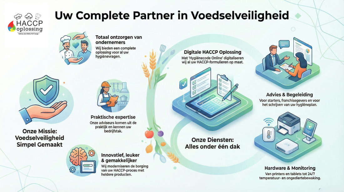 Wij geloven dat voedselveilig werken praktisch, overzichtelijk en werkbaar moet zijn. Daarom combineren wij advies, opleidingen, audits, digitalisering en hardware tot één geïntegreerde totaaloplossing. Alles onder één dak, met één aanspreekpunt.