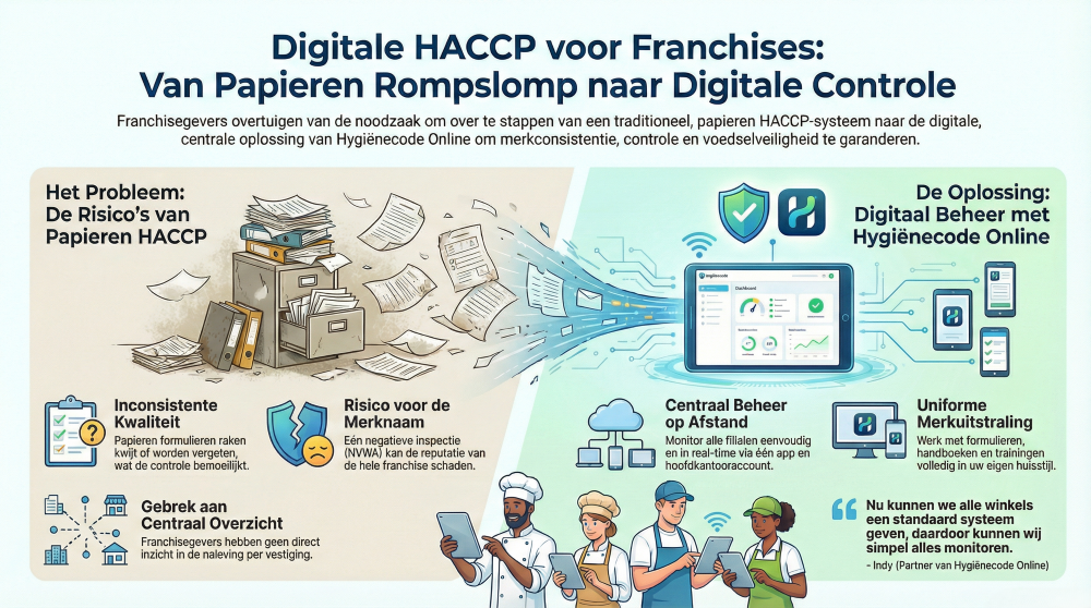 Elke franchiseondernemer moet een voedselveiligheidssysteem bijhouden dat gebaseerd is op de HACCP-systematiek. Helaas worden HACCP-formulieren vaak vergeten of raken ze kwijt, en soms ontbreken zelfs de juiste meetinstrumenten. De bekende papieren aan de muur worden al snel over het hoofd gezien, wat het risico op fouten vergroot.